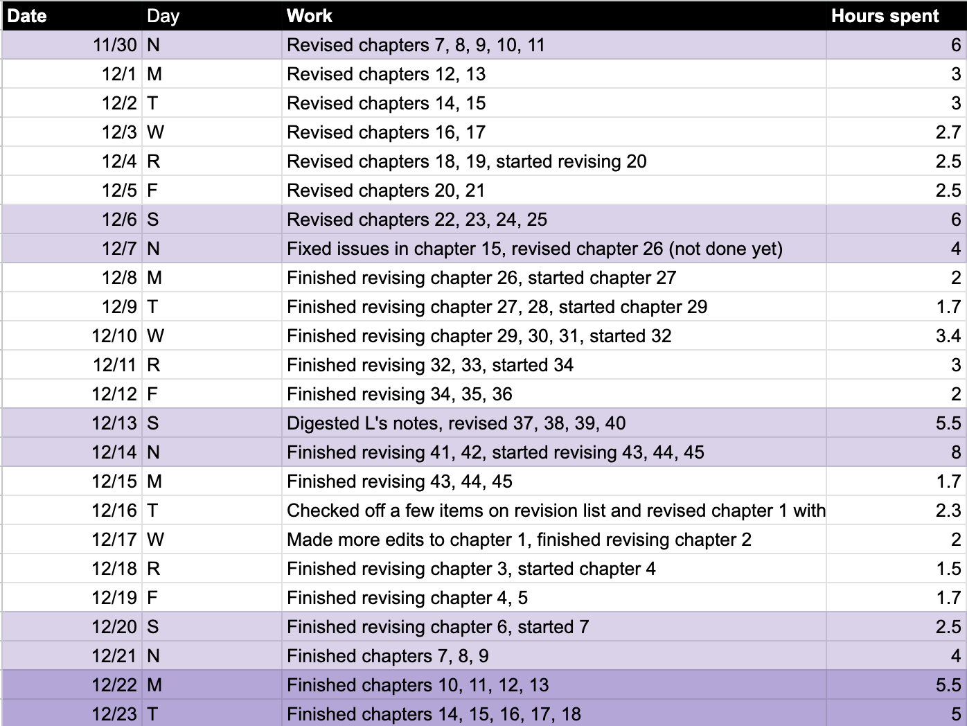 For much of 2025, I felt like I was spending a lot of time on the novel, but I couldn’t tell if I was actually making progress. There was always so much more to do, and I often found myself going back to previous chapters to fix new issues. It felt like I was sprinting really hard and not getting anywhere. I took inspiration from Delia Cai’s revision tracker and created a progress log of what I did each day and how many hours I spent on it. Seeing this documented alleviated the fear that I was on a doomed Sisyphean mission. I will be doing this with future projects and recommend it to anyone suffering from “circular momentum” syndrome.